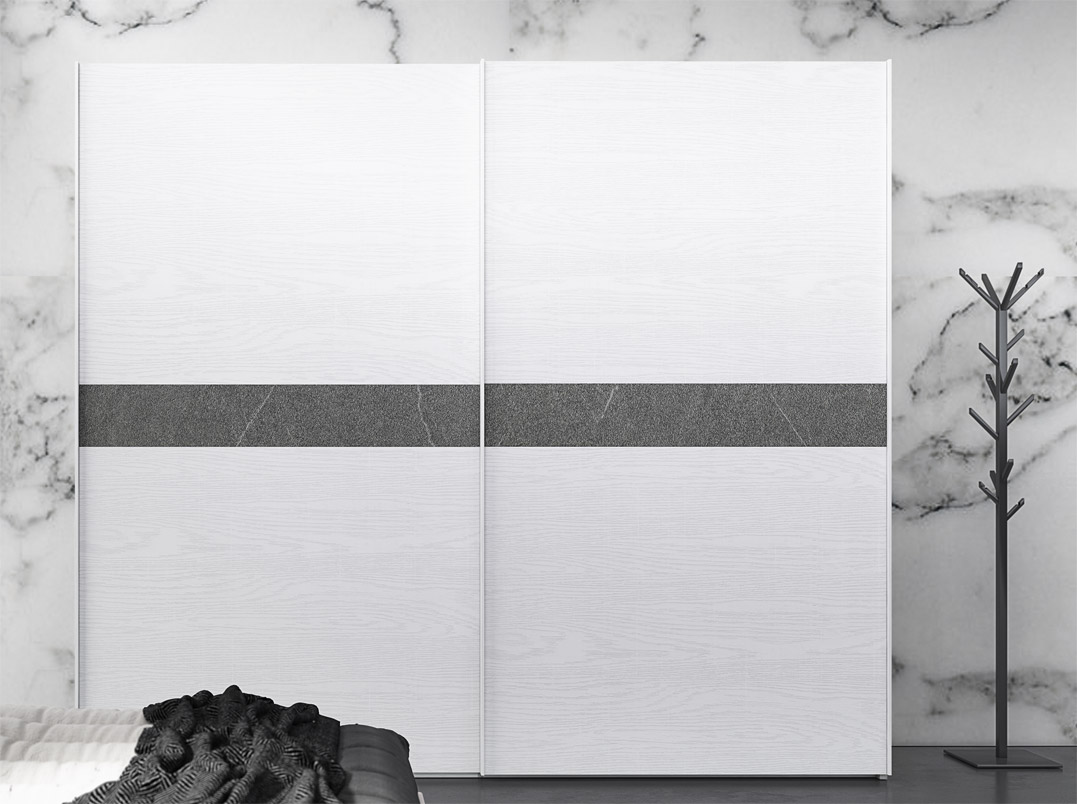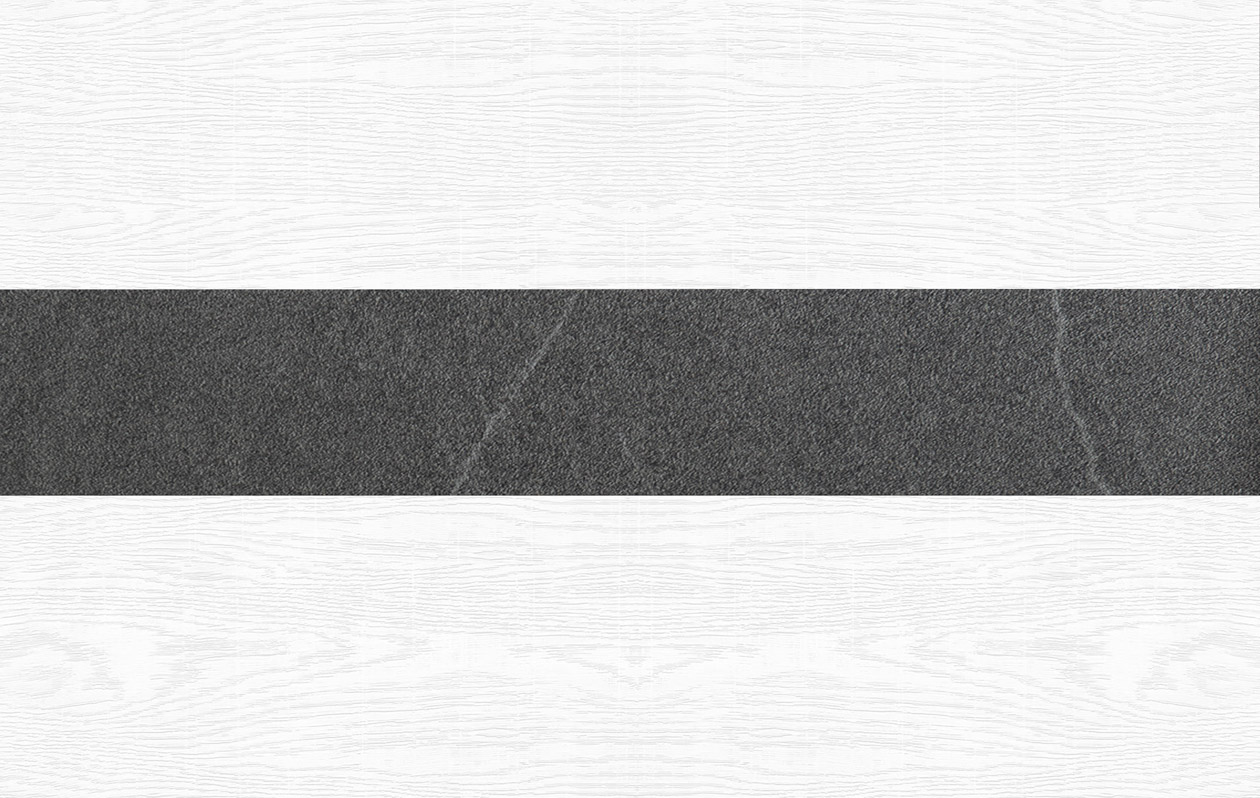 Montrée en photo en finition frêne couleur craie et gris foncé, avec application de pierre.