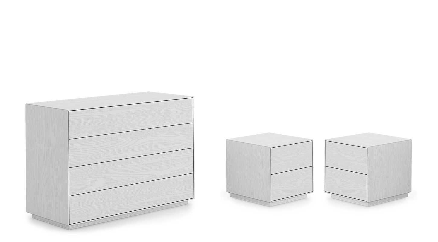 Composé d'une commode à 4 tiroirs et de deux tables de chevet à 2 tiroirs chacune.