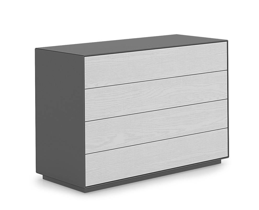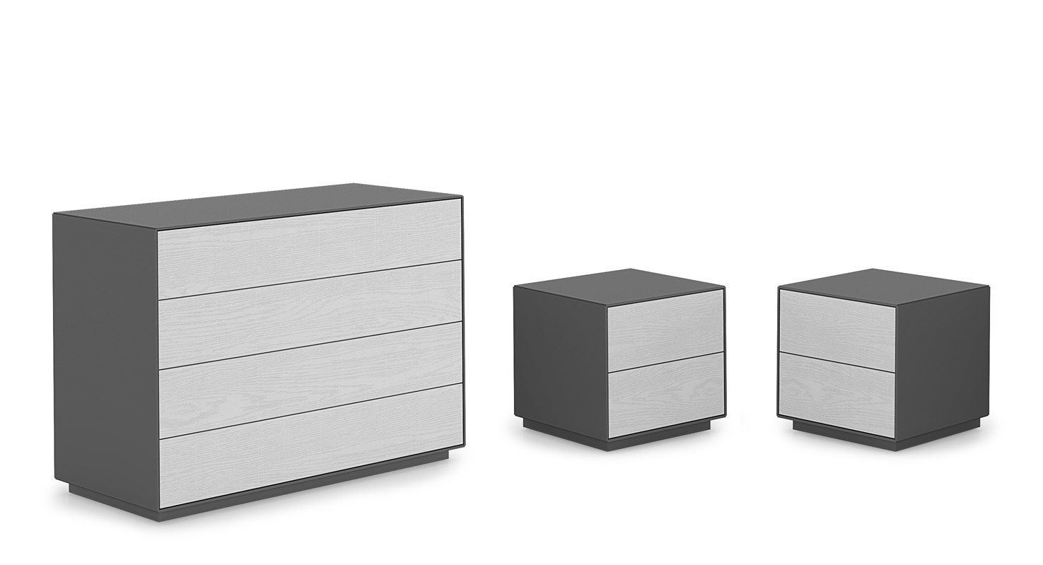 Présentés ici avec coque en finition gris foncé et façade des tiroirs en finition frêne couleur craie.