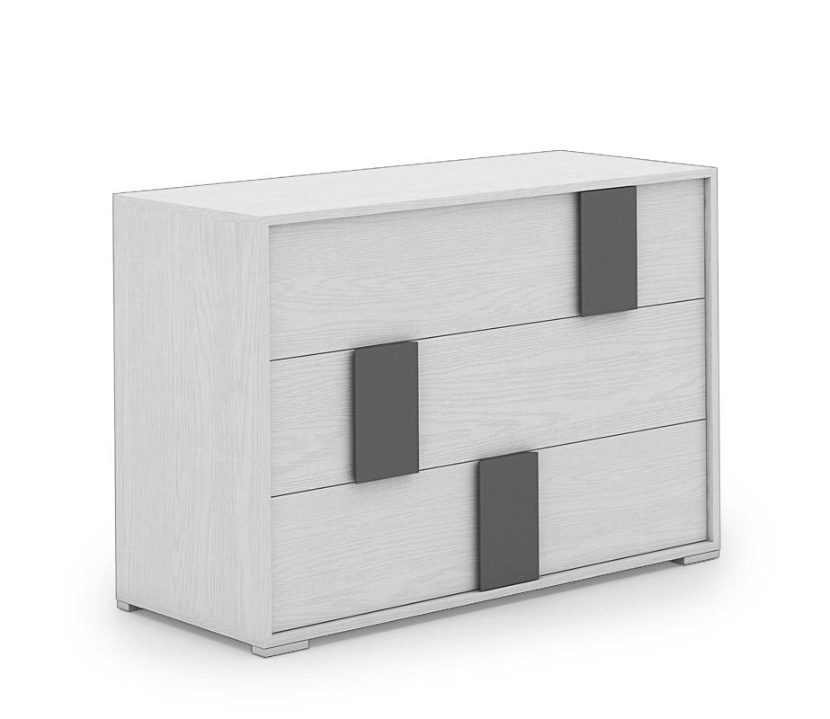 Présentés ici en finition frêne couleur craie avec des poignées gris foncé.