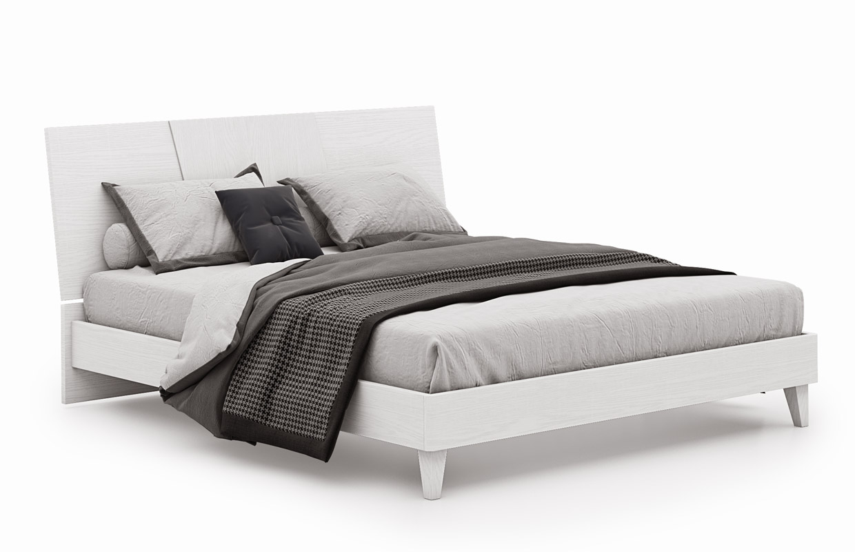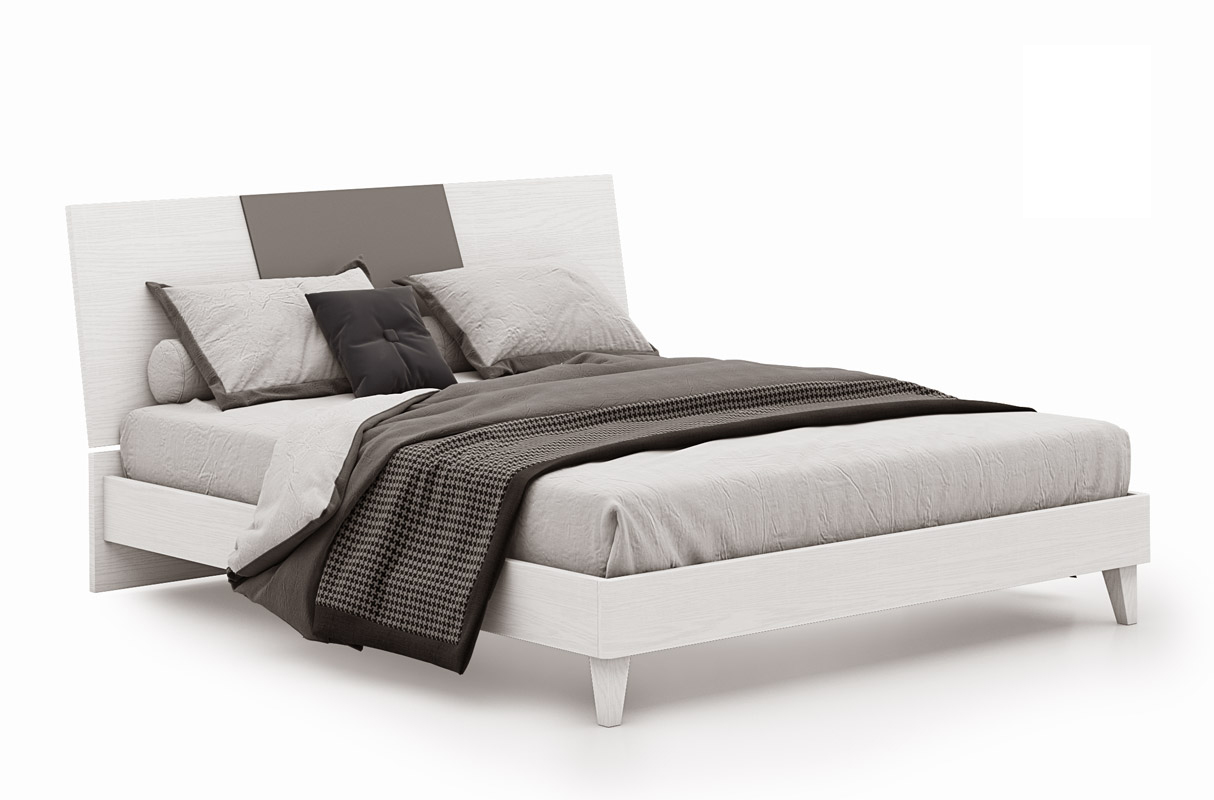 Equipé d'un cadre de lit et d'une tête de lit en finition frêne couleur craie, également disponible bicolore avec des inserts gris foncé.