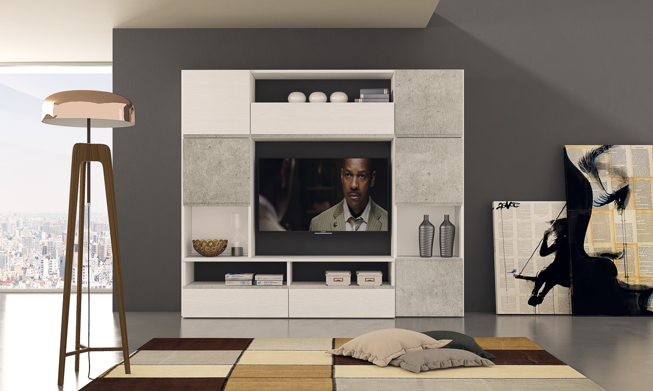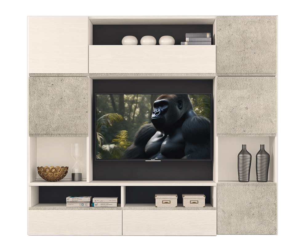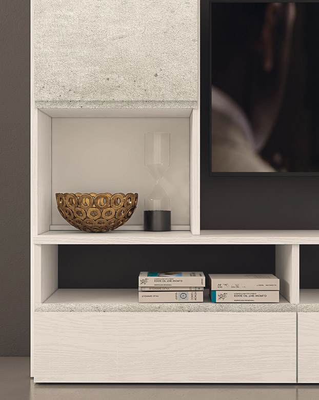 Un mur de salon au style frais et contemporain avec une finition spéciale en ciment qui met en valeur les portes de cette composition.