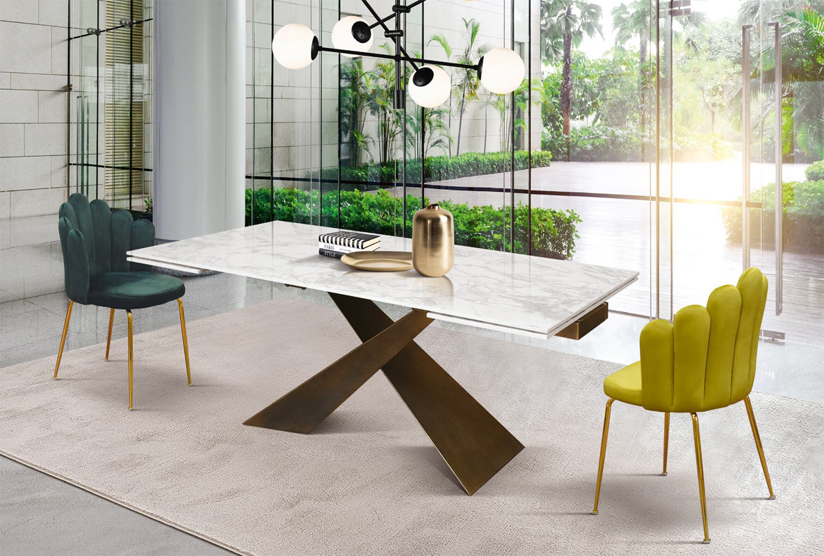 Son plateau est en céramique avec une finition en marbre de Carrare et dispose de deux rallonges latérales de 40 cm chacune. Inviter vos convives à dîner ne sera donc pas un problème!