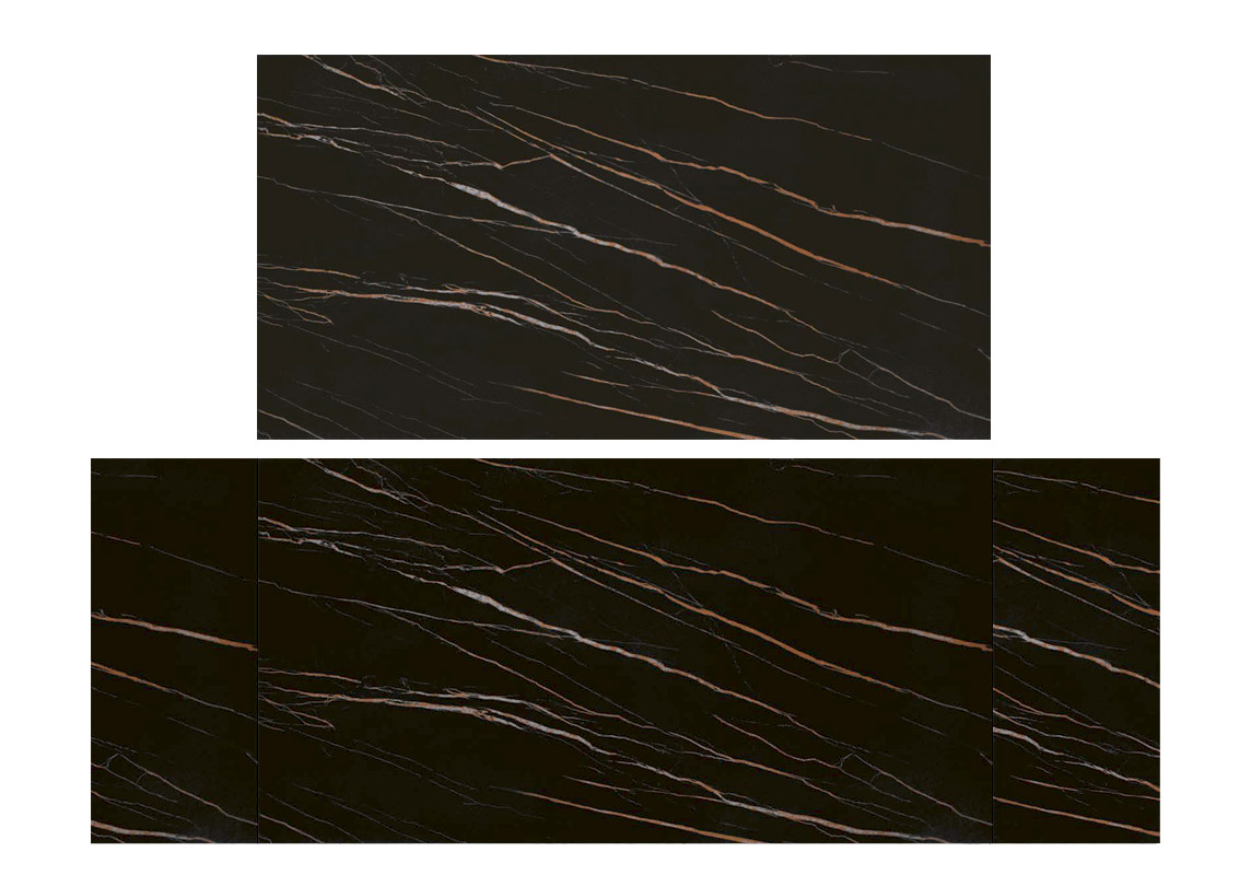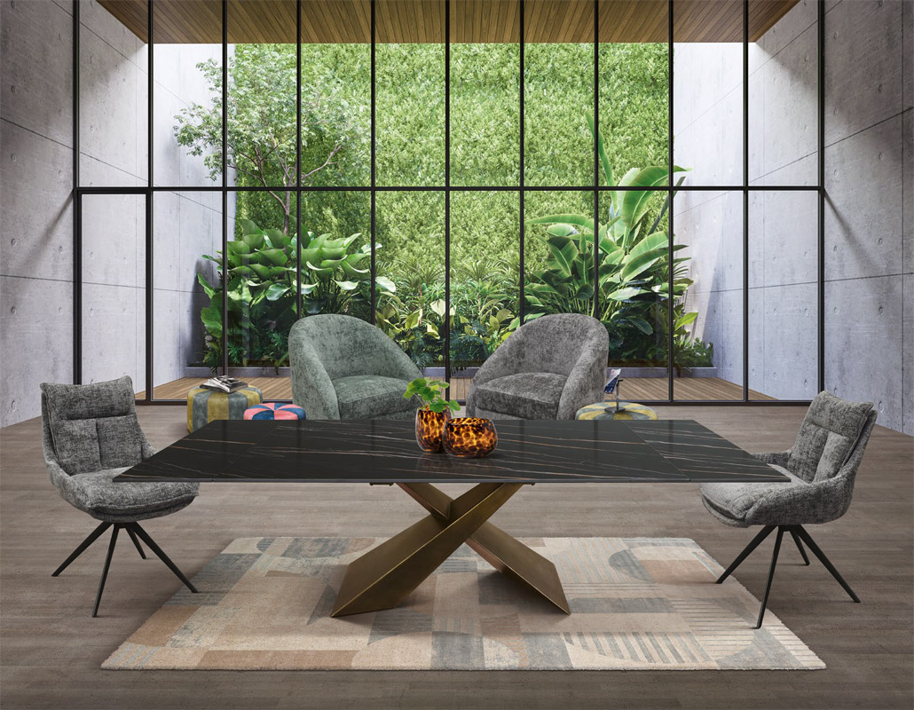 L'élégant plateau est en céramique avec un effet marbré noir. Il est doté de deux rallonges confortables, idéales pour accueillir vos invités lors de dîners conviviaux.