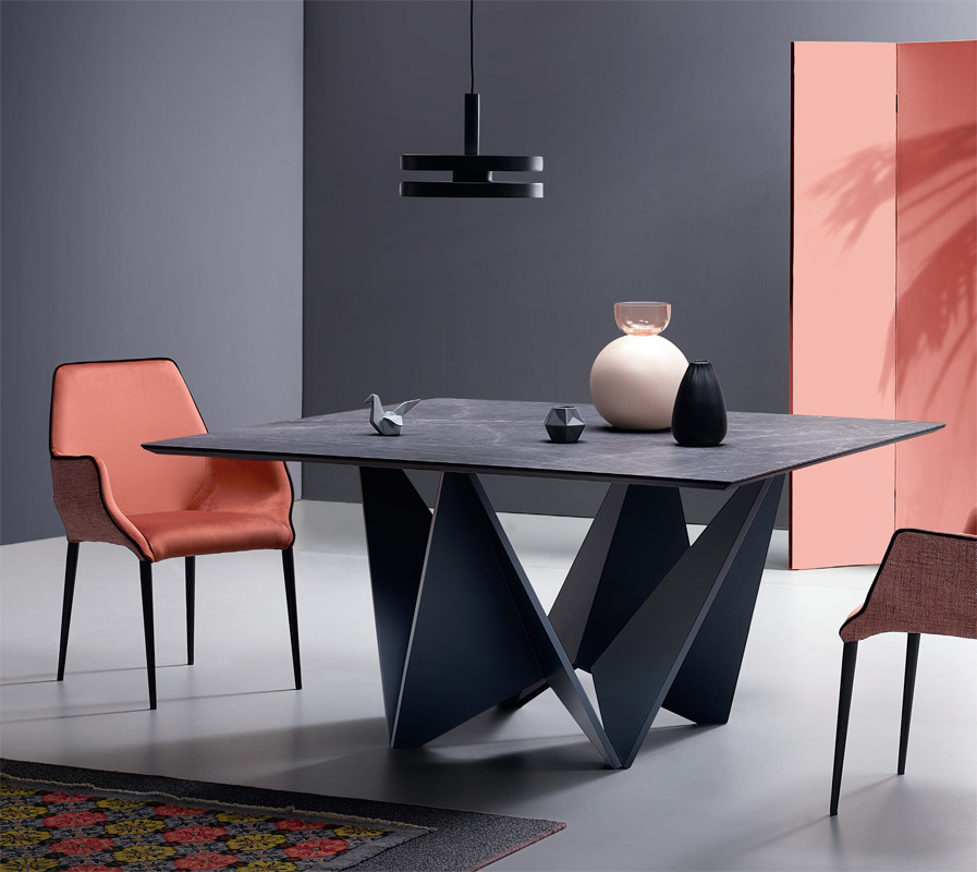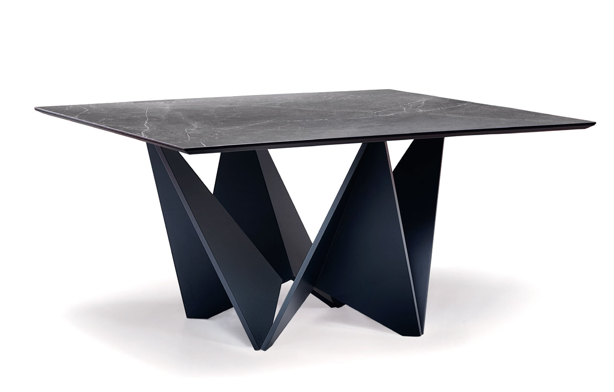 Table carrée avec un plateau fixe et un piètement distinctif de style origami japonais.
