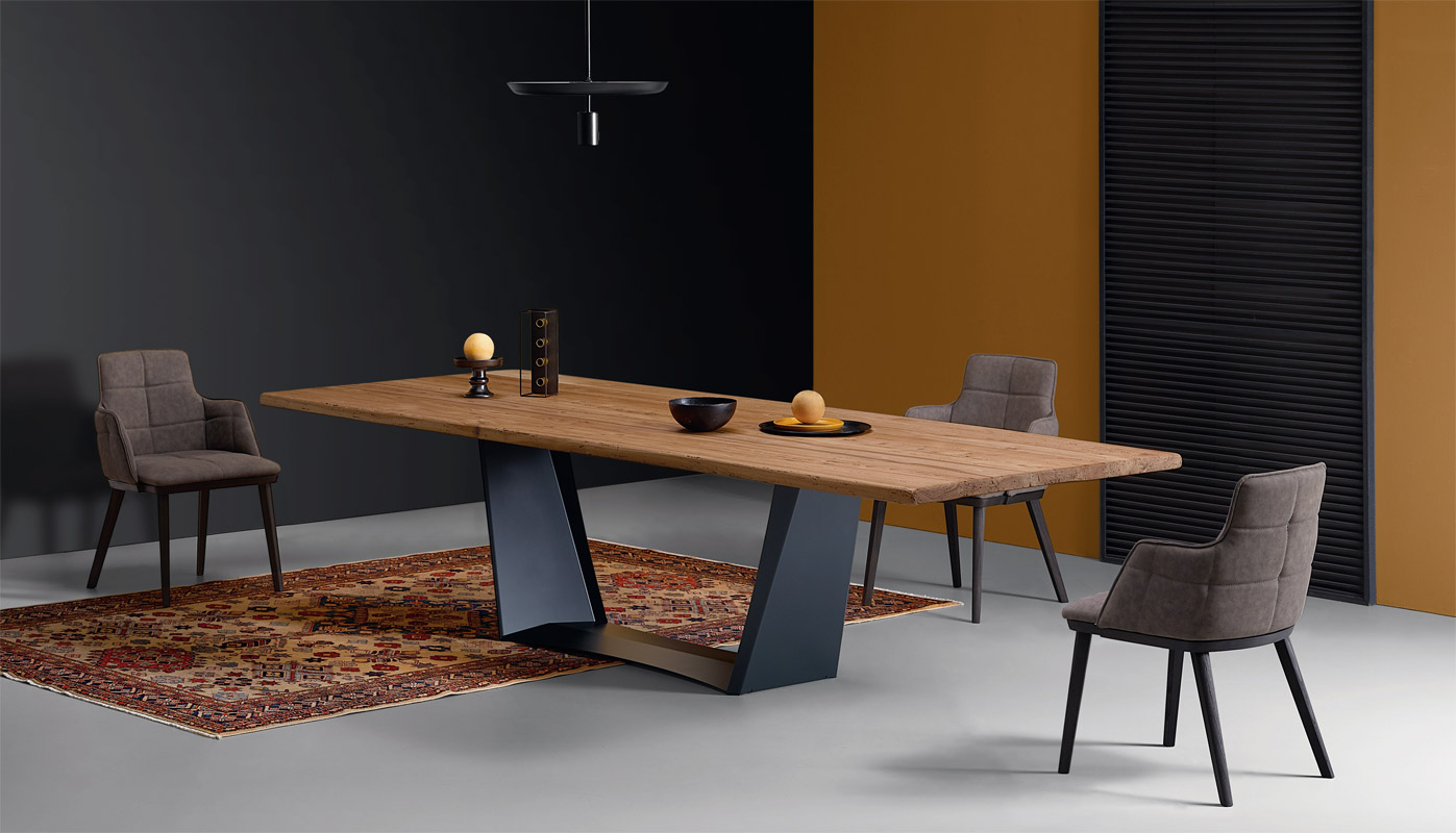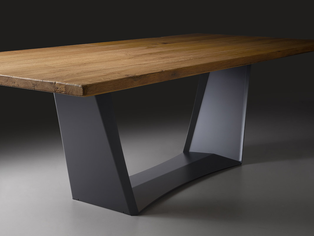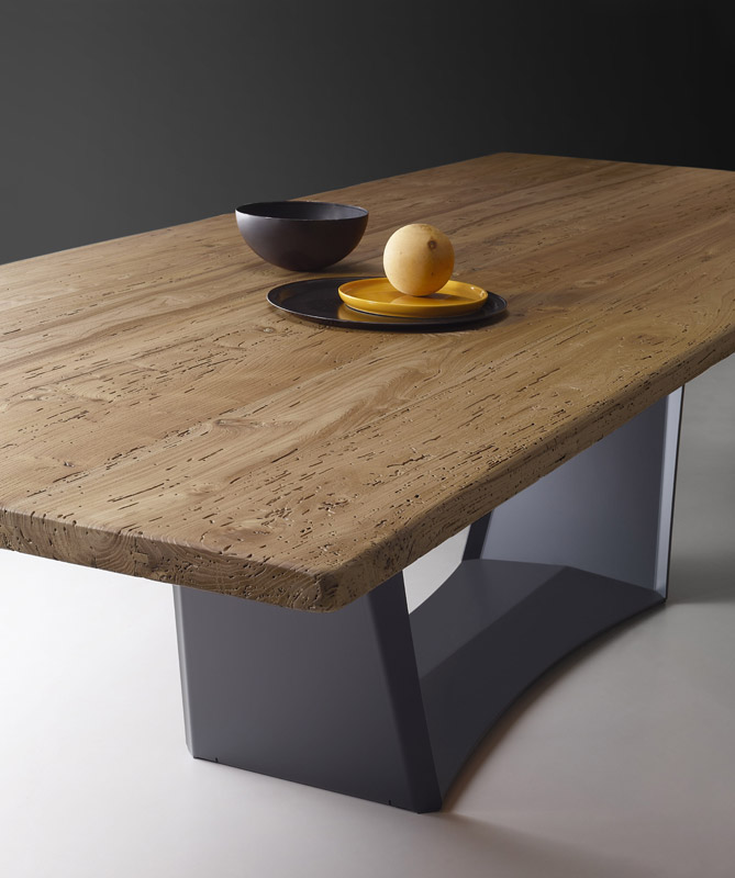 Le dessus est en chêne naturel d'une épaisseur de 3 cm. La particularité est le bord du plateau qui peut être droit, biseauté, écorcé ou croisé.