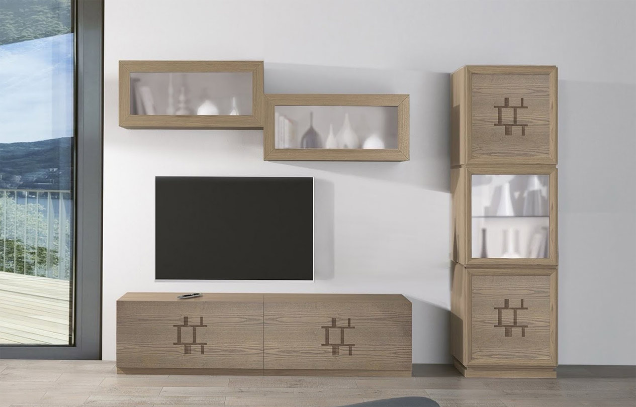 Une composition murale TV de style contemporain, qui combine des éléments de style raffiné, comme les sculptures géométriques, et le bois de frêne plus contemporain, avec une touche de luminosité donnée par le verre de certaines portes.