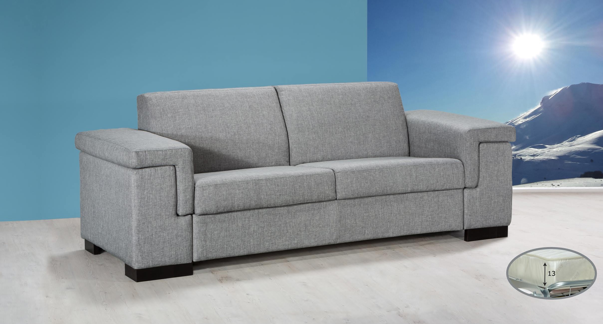 Canapé-lit déhoussable avec cadre en bois robuste et suspension interne par sangles élastiques très résistantes. L'assise et le dossier en mousse de polyuréthane haute densité offrent un confort maximal. Comprend une base de lit électrosoudée et un matelas en mousse (100x190x13 cm), parfaits pour un repos optimal. Doté d'une cavité porte-oreiller pour plus de praticité, il est idéal pour les environnements modernes et fonctionnels.