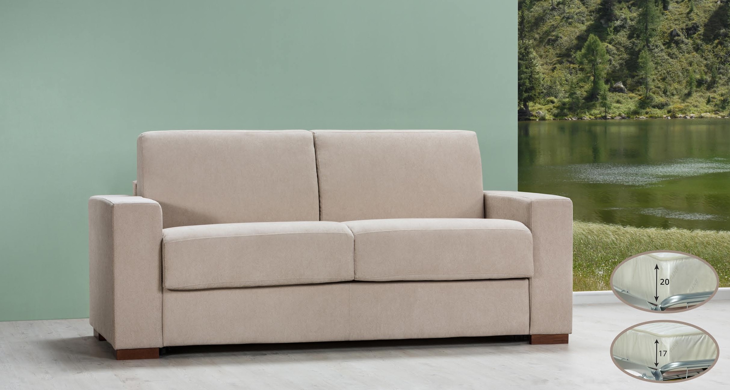 Canapé-lit déhoussable avec cadre en bois massif, conçu pour durer. La suspension interne avec sangles élastiques à haute résistance et le rembourrage en mousse de polyuréthane à haute densité garantissent un confort maximal. Equipé d'un sommier électrosoudé et d'un matelas en mousse (100x190 cm) disponible en deux hauteurs : 13 cm ou 20 cm. Le creux de l'oreiller ajoute praticité et fonctionnalité, ce qui en fait le choix idéal pour un salon moderne et polyvalent.