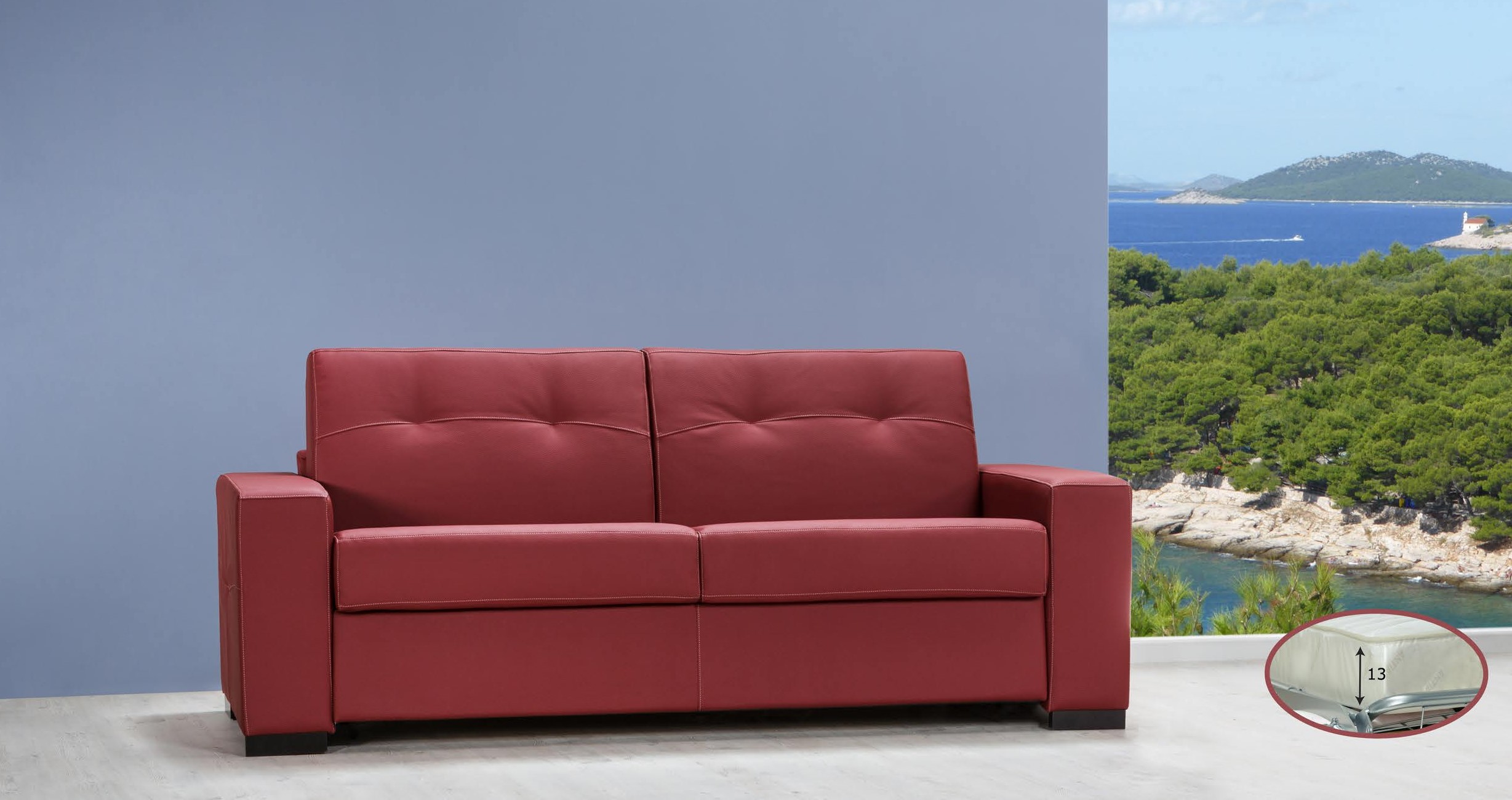 Un canapé rouge élégant et pratique, parfait pour les environnements modernes. La structure en bois robuste, combinée à la suspension interne par sangles élastiques et au rembourrage en mousse de polyuréthane à haute densité, garantit la durabilité et le confort. Il comprend un lit avec sommier électrosoudé et matelas en mousse (100x190 cm, hauteur 13 cm), équipé d'une cavité porte-oreiller pour plus de praticité.