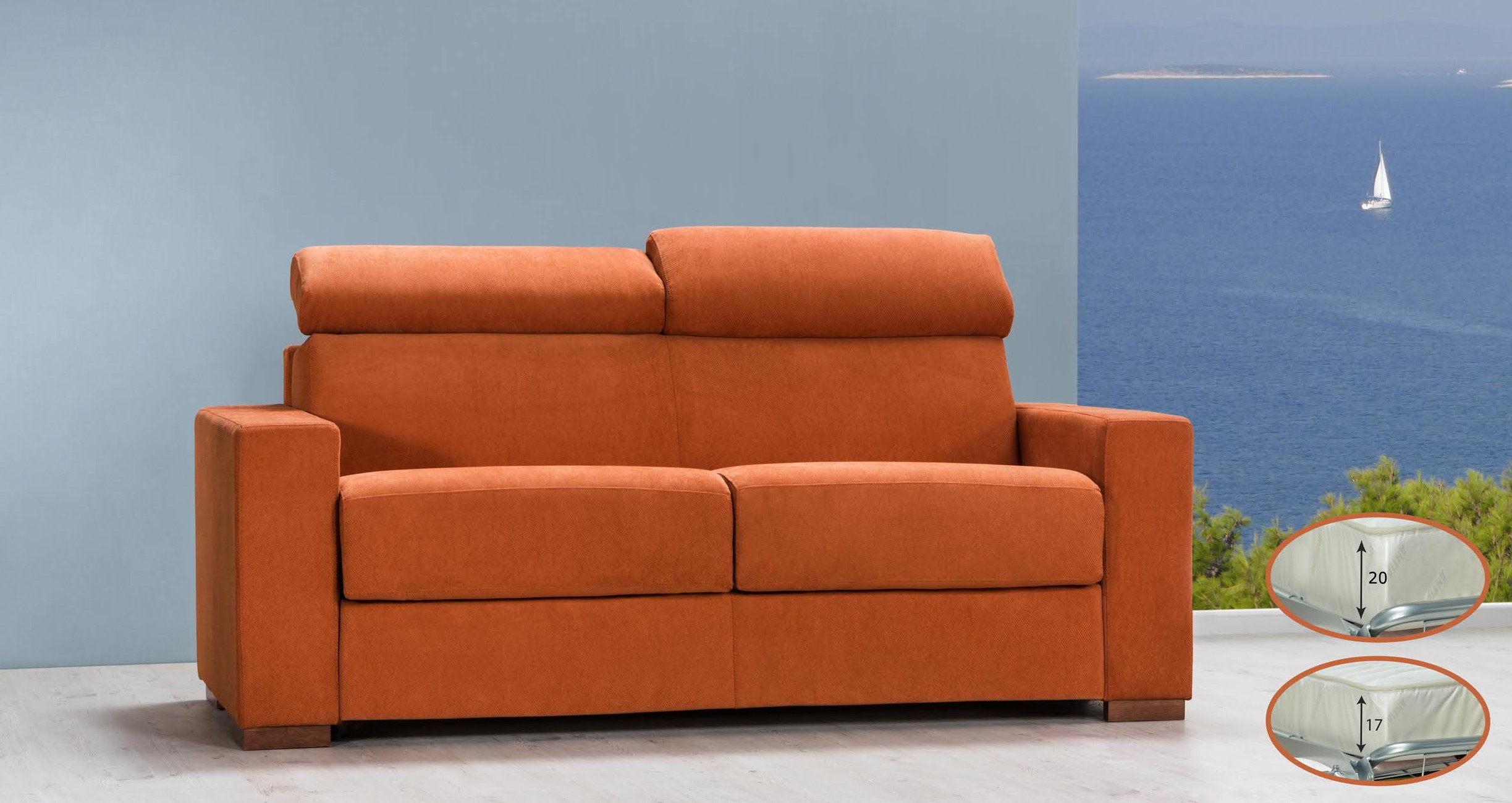 Un canapé orange élégant et pratique, conçu pour le confort et la fonctionnalité. La structure en bois robuste, associée à la suspension interne par sangles élastiques à haute résistance et au rembourrage en mousse de polyuréthane à haute densité, garantit la durabilité et le confort dans le temps.