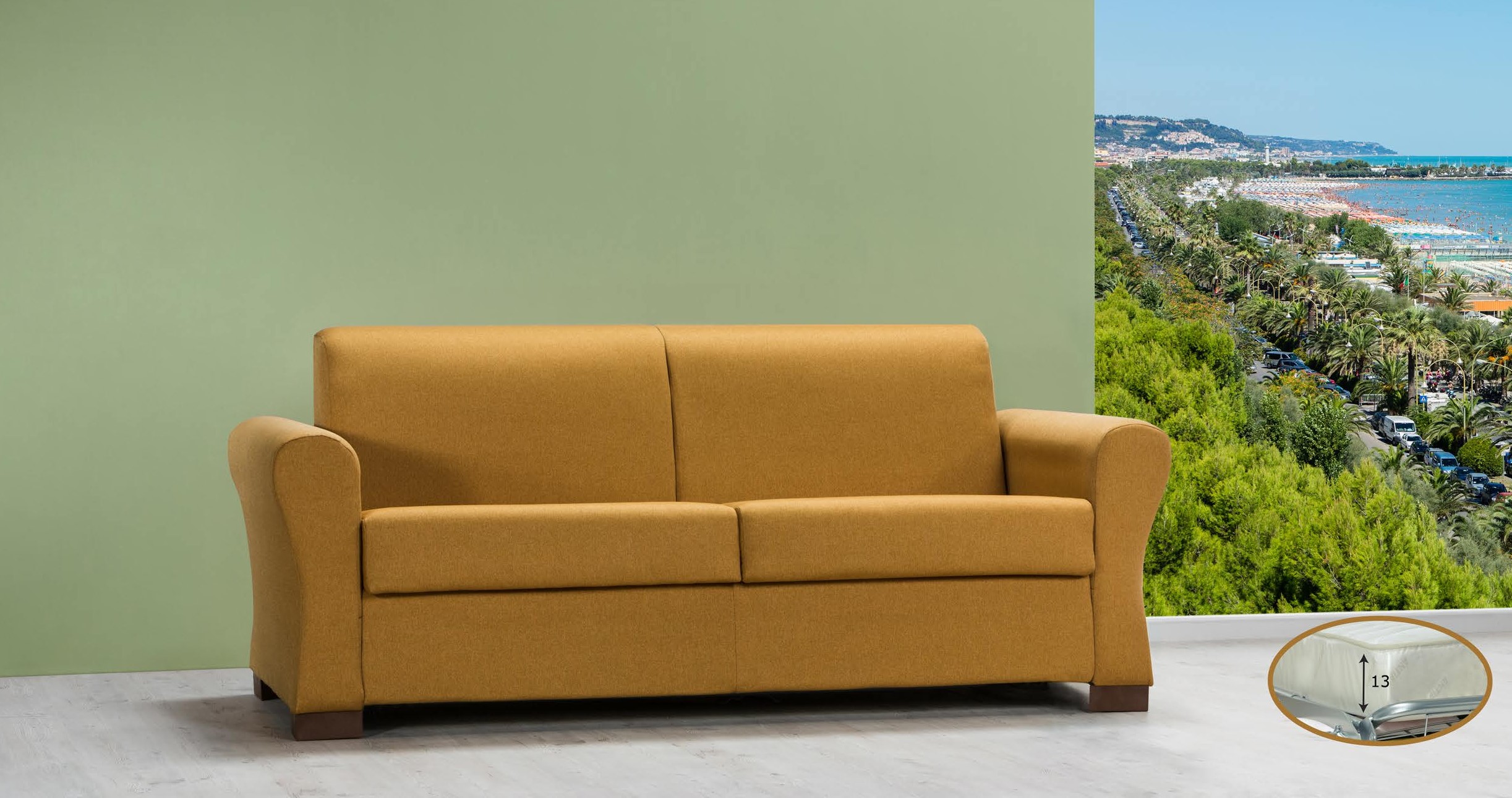 Un canapé fonctionnel et moderne, idéal pour ceux qui recherchent le confort et le design en un seul produit. La structure en bois robuste, combinée à une suspension interne avec des sangles élastiques à haute résistance et un rembourrage en mousse de polyuréthane à haute densité, garantit le confort et la durabilité.