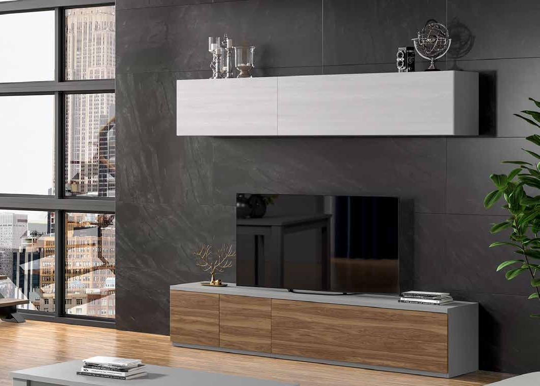 Cet ensemble TV a tout pour vous séduire : vitrines à abattant avec détails en bois, tiroirs avec système de fermeture amortie, étagère avec tiroir secret, grand banc d'appui.