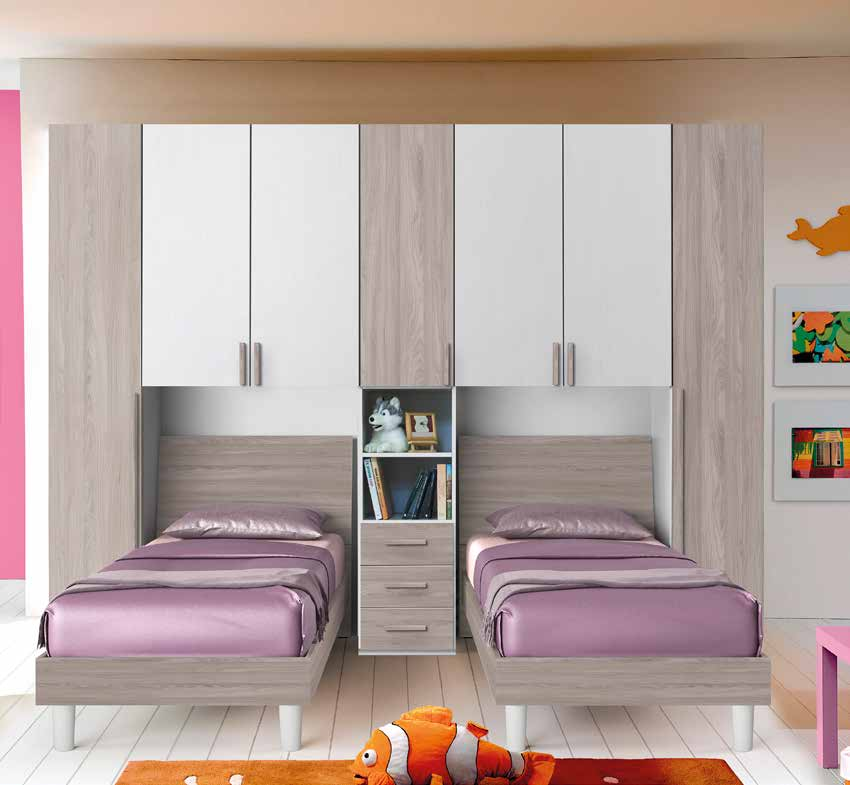 Composée de: armoire à 6 portes battantes, 2 tables de chevet à deux tiroirs, commode à trois tiroirs, lit et miroir.