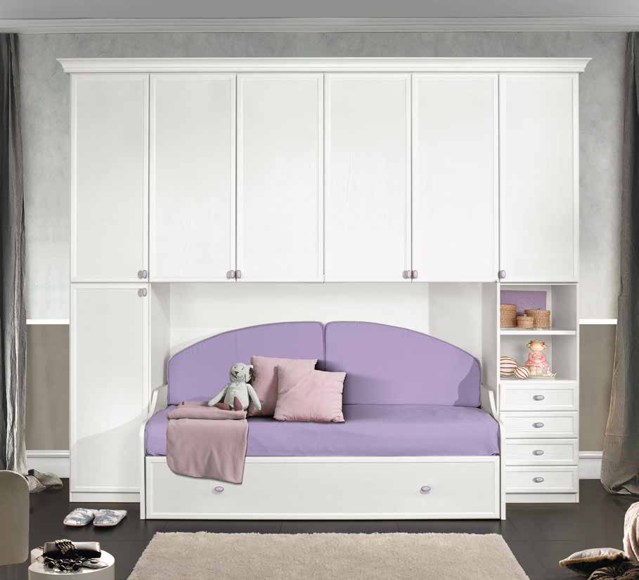 Composée de: armoire avec trois portes battantes, table de chevet avec deux tiroirs, commode à trois tiroirs sur roulettes, bureau, 3 étagères, lit de 120 cm avec rangement.