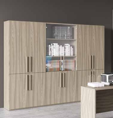 Les portes inférieures ont une hauteur de 85 cm, les portes supérieures s'étendent jusqu'à 210 cm, offrant de nombreuses étagères pour livres, classeurs, dossiers, catalogues, échantillons et documents divers. L'armoire peut également être placée dans le salon, le couloir ou la buanderie, pour ranger, par exemple, le linge de maison, les couvertures et la vaisselle, en réservant la partie centrale aux objets qui peuvent rester visibles. Les deux portes en verre apportent une touche de légèreté à l'ensemble et le rendent plus frais.