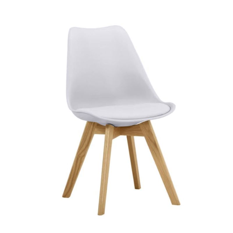 Belle structure en bois naturel, partie supérieure en plastique avec assise en similicuir dans la même teinte blanche. Une chaise qui peut donner une touche de fraîcheur et de modernité à l'environnement.