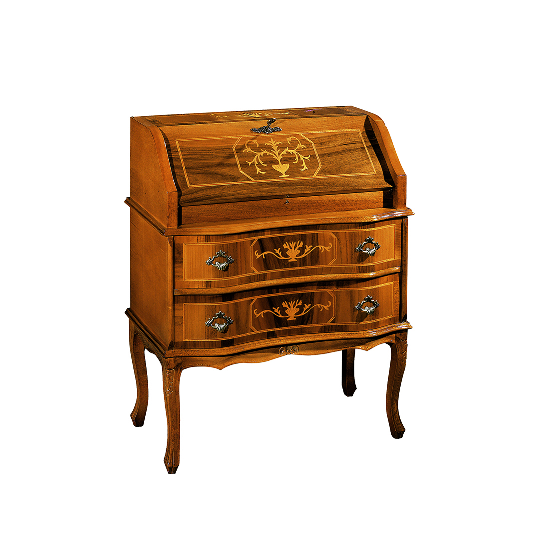 Magnifique bureau de style classique avec abattant et deux tiroirs spacieux dans la partie inférieure. L'abattant, fermé par une serrure, est doté d'une étagère pratique à l'intérieur, de petits tiroirs et de petits compartiments.