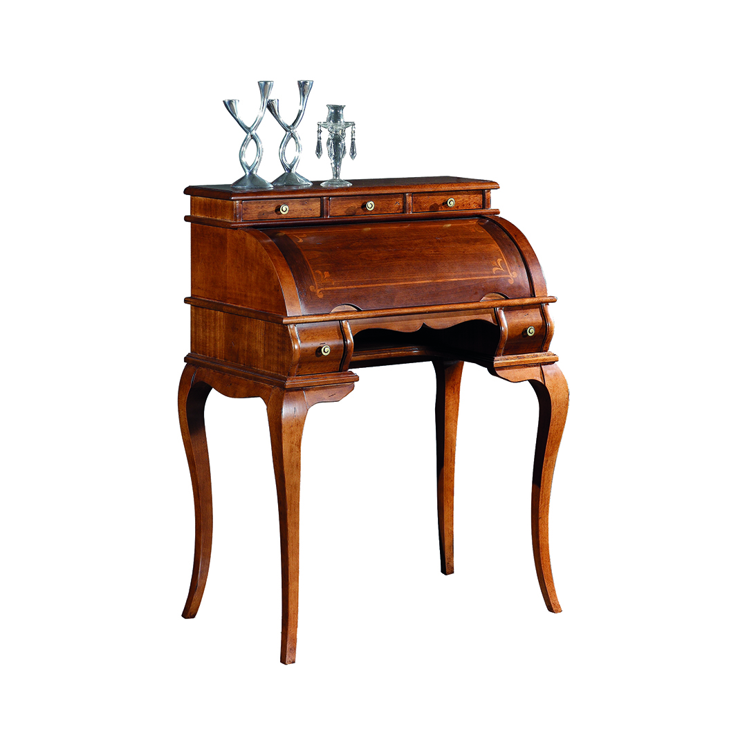 Un bureau à 5 petits tiroirs, avec une tablette extractible supplémentaire et un volet cachant 4 compartiments ouverts et une tablette, utile pour garder la pièce en ordre.