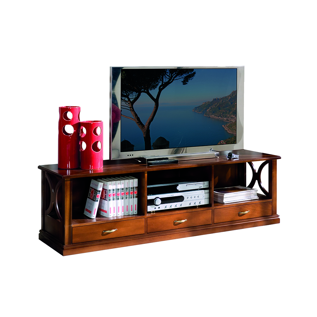 Un grand plateau sur le dessus pour la télévision et les appareils, 3 grands compartiments et 3 tiroirs spacieux pour ranger divers objets et magazines.
